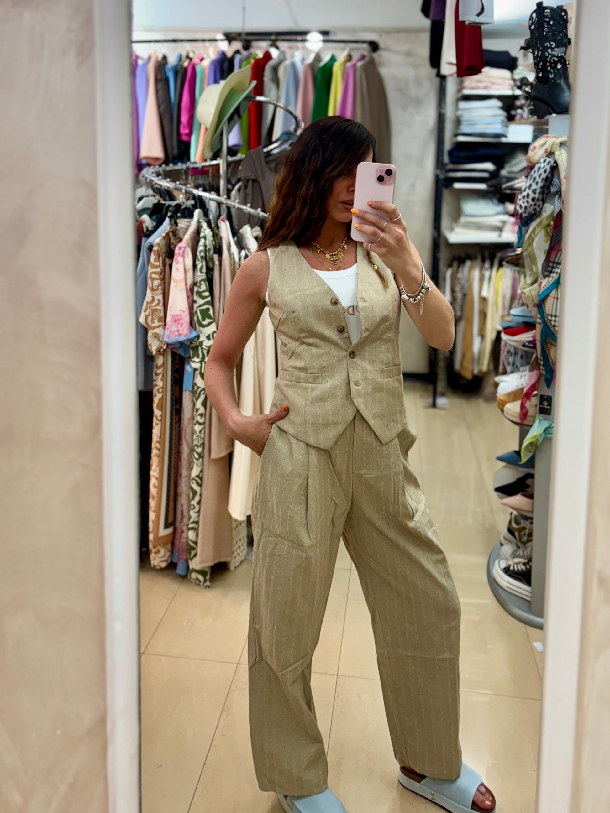 Tailleur in misto lino composto da pantalone con bottone davanti ed elastico dietro panciotto con bottoni frontali