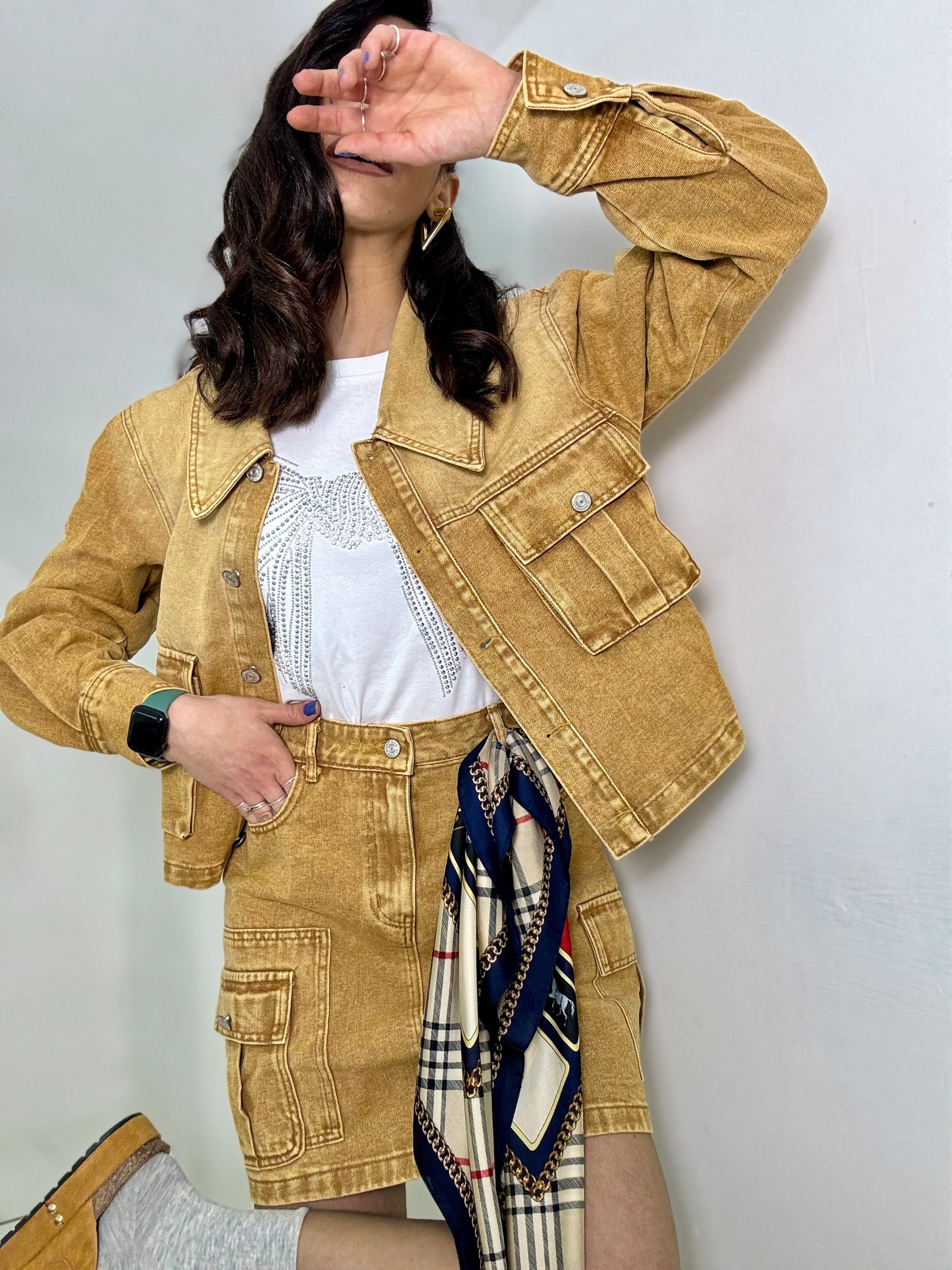 Set in denim lavaggio sabbiato rame tessuto semi rigido vestibilità morbida