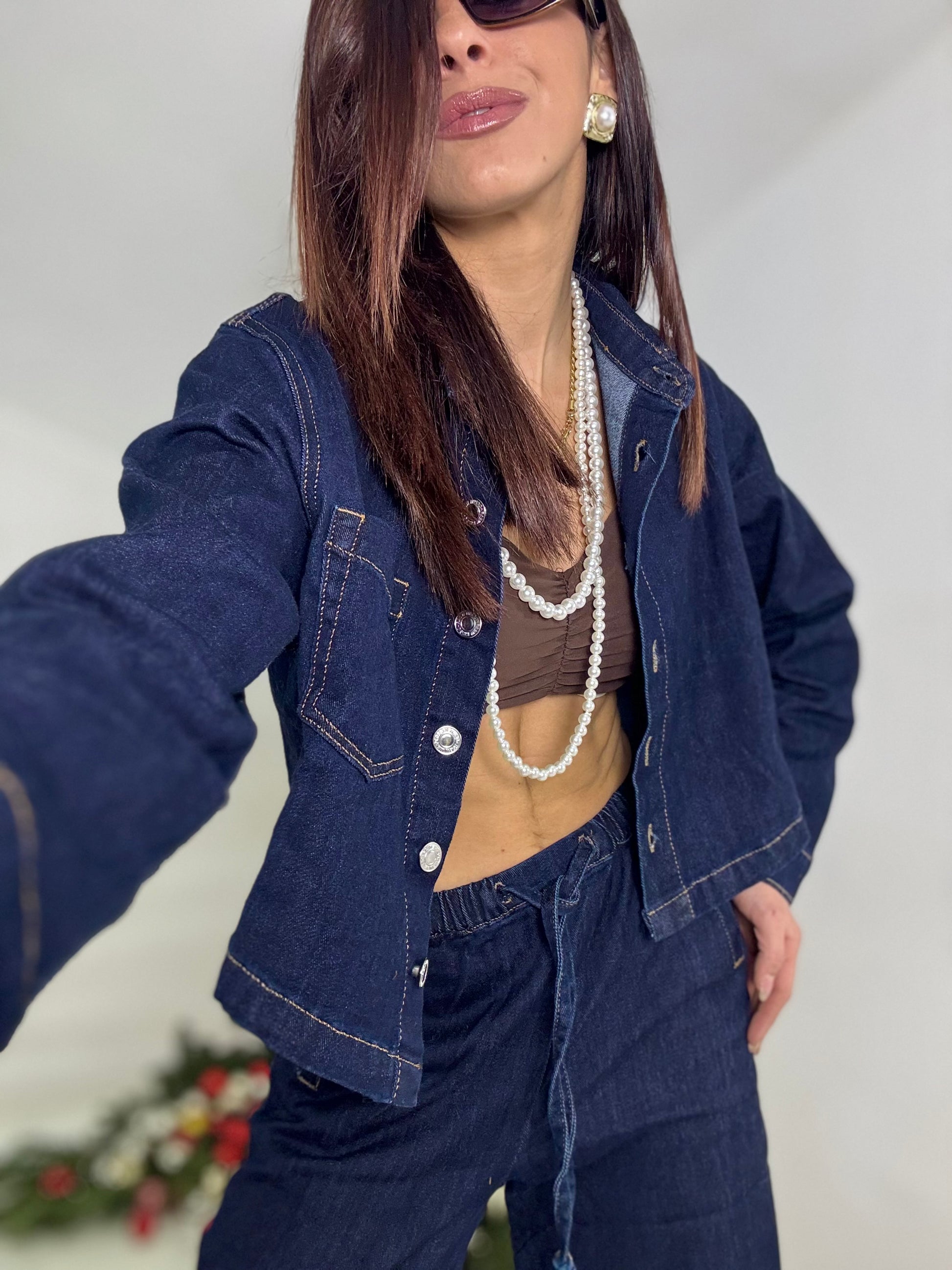 Set composto da camicia CROP lavaggio blu scuro tessuto leggermente elastico e pantalone con elastico e laccetti in vita scende a palazzo