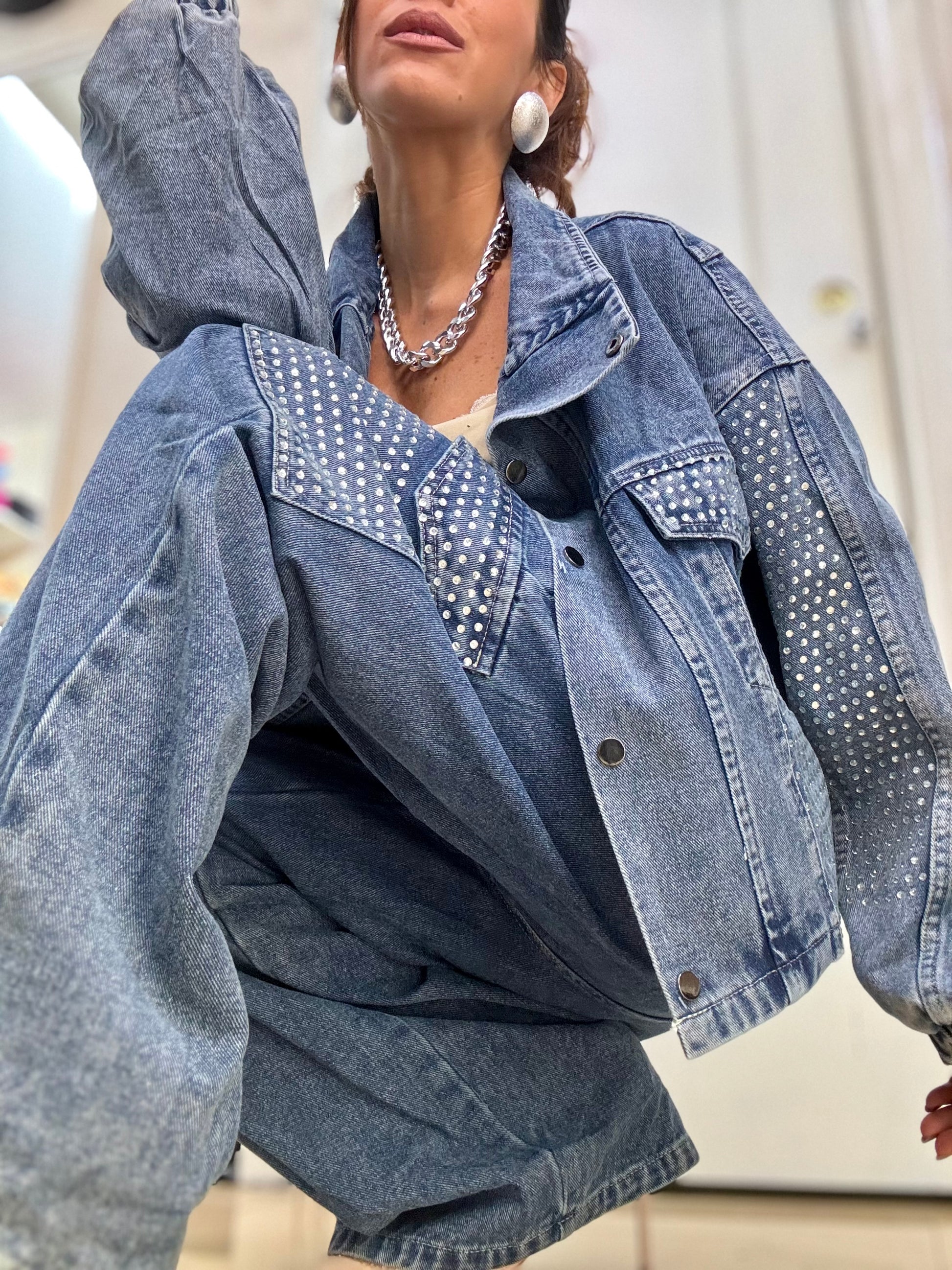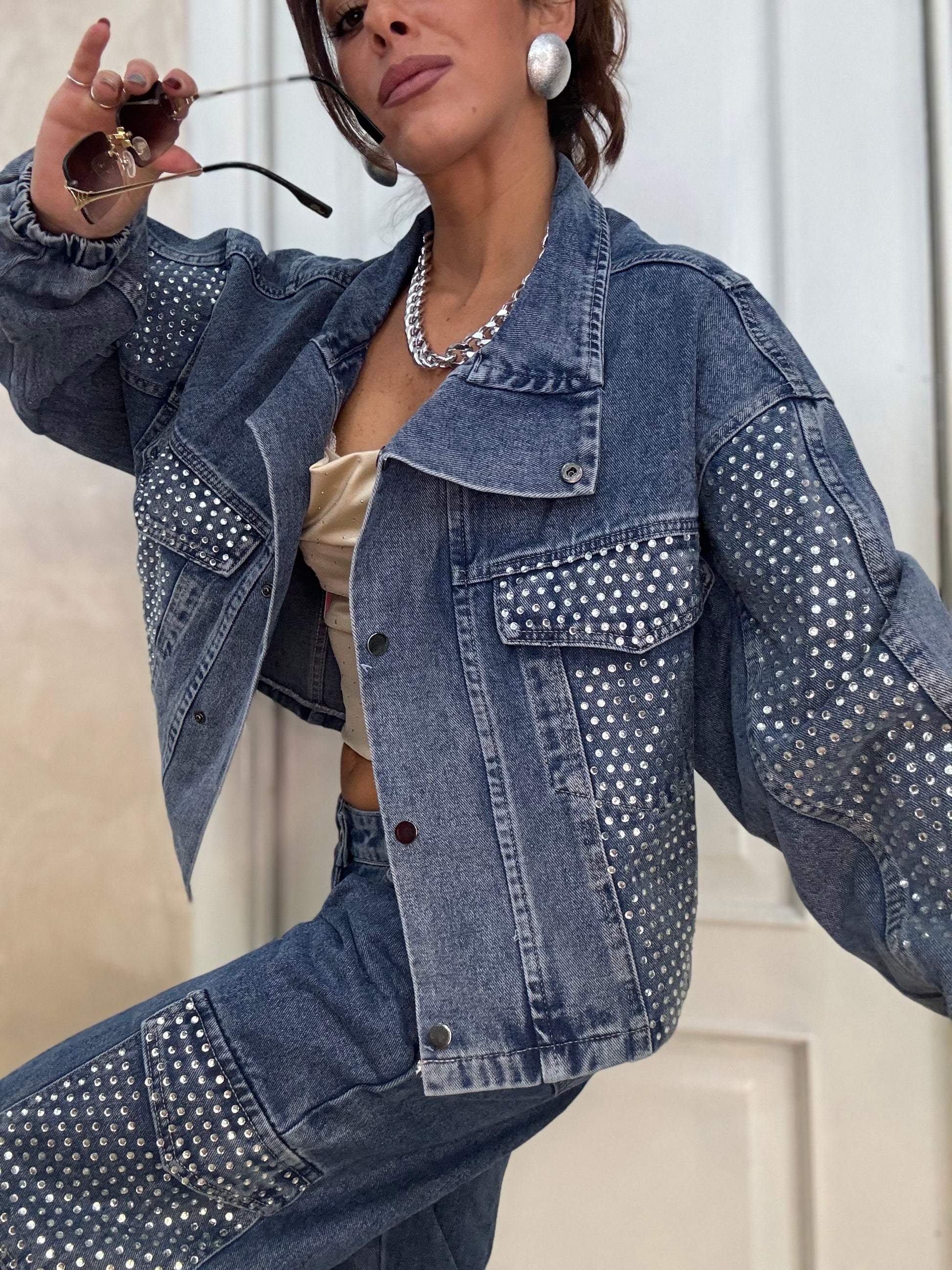 Set composto da camicia giacca con taschini frontali e interno braccia strassato jeans vita bassa gamba dritta vestibilità morbida