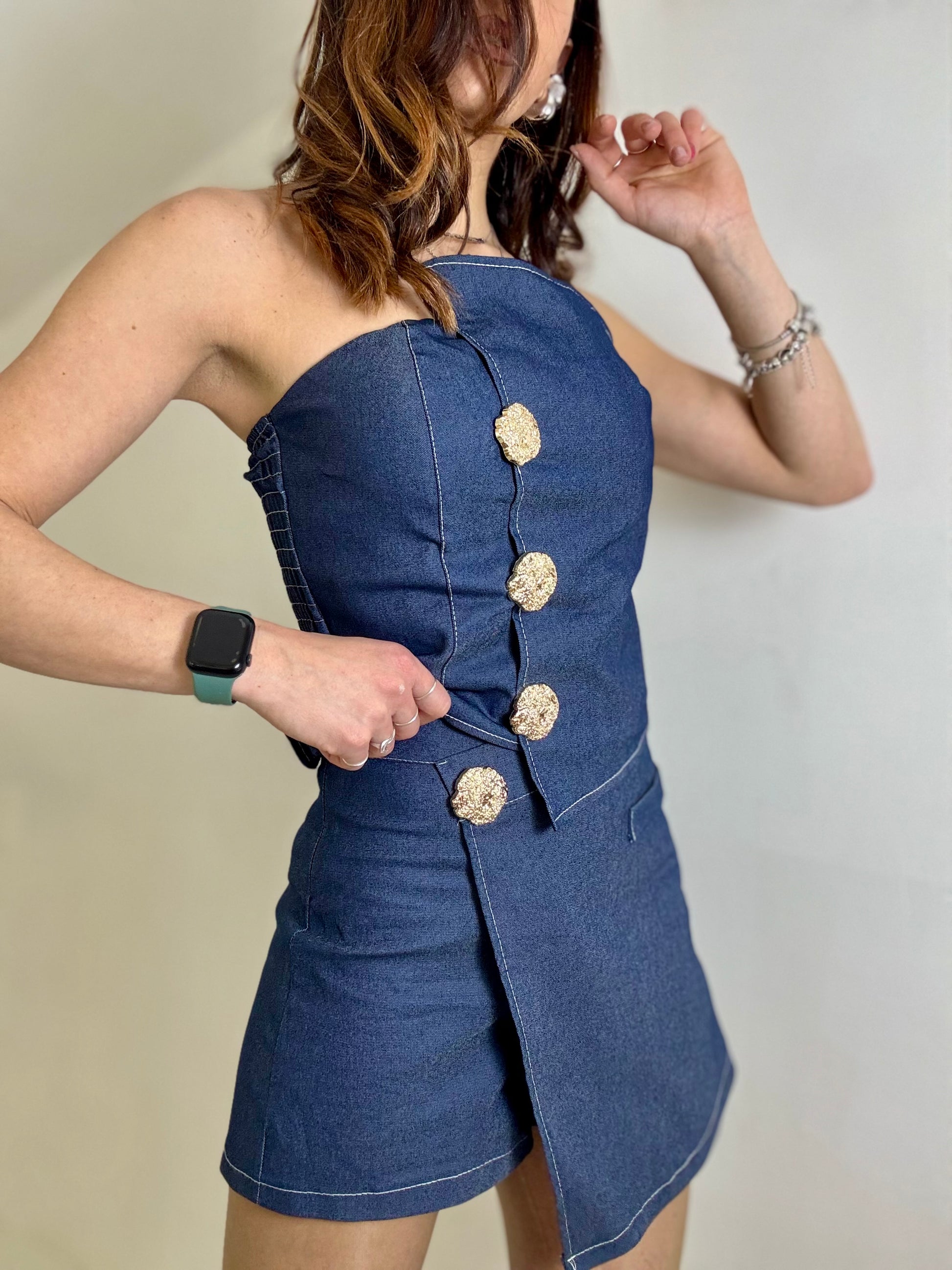 Setto composto da Panta Gonna taglia asimmetrico e top taglia a asimmetrico con l’applicazione di spille, effetto bottone, tessuto e elastico