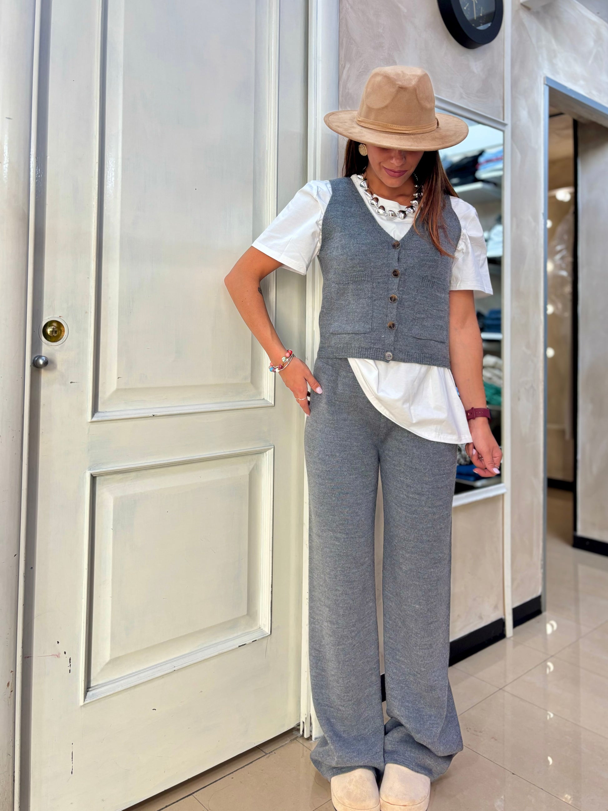 Set in lana composto da pantalone a palazzo e gilet con bottoni frontali