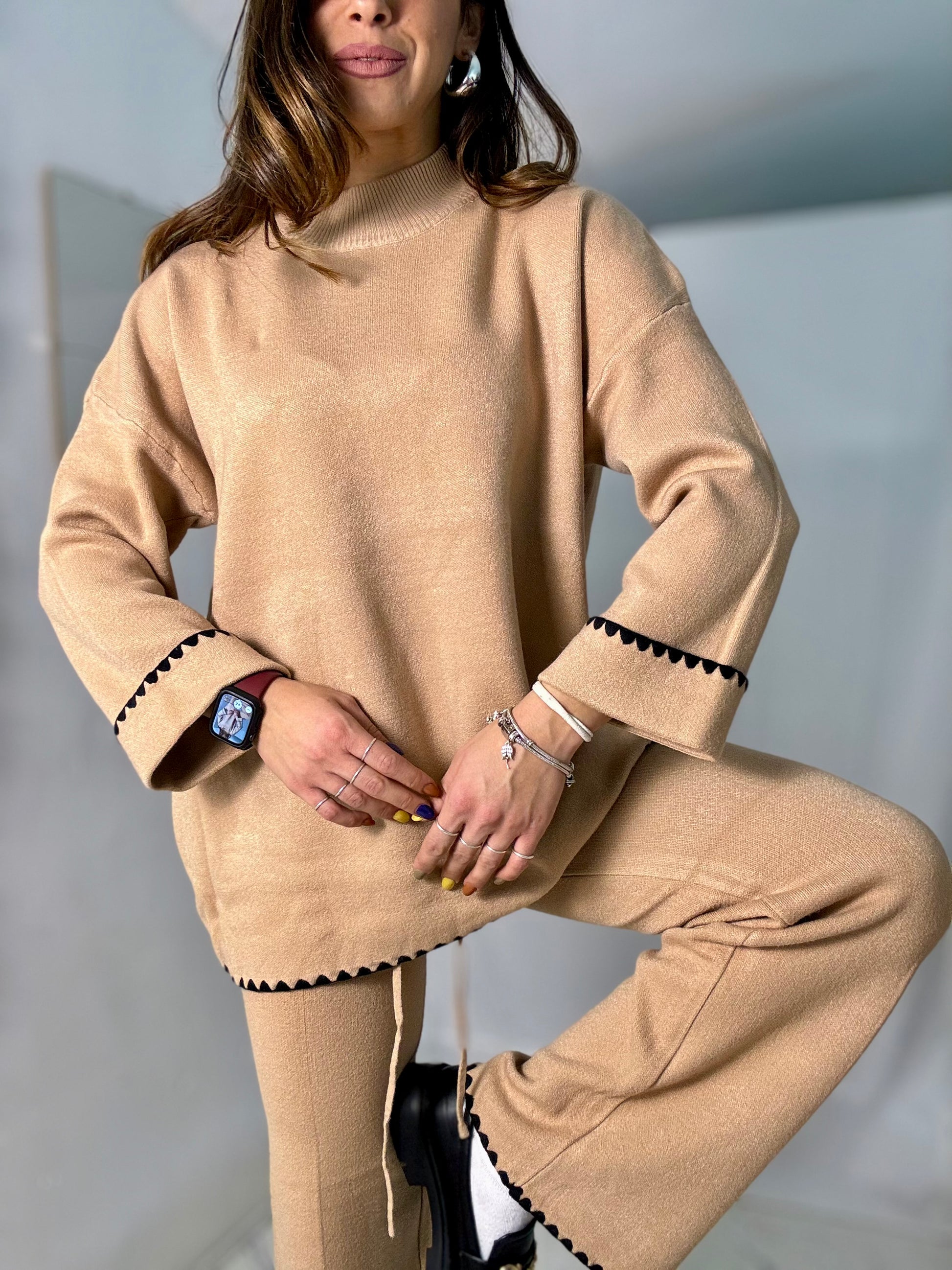 Set in lana composto da pantalone a palazzo e maglia mezzo collo con dettagli orlino colore a contrasto veste fino ad una 46