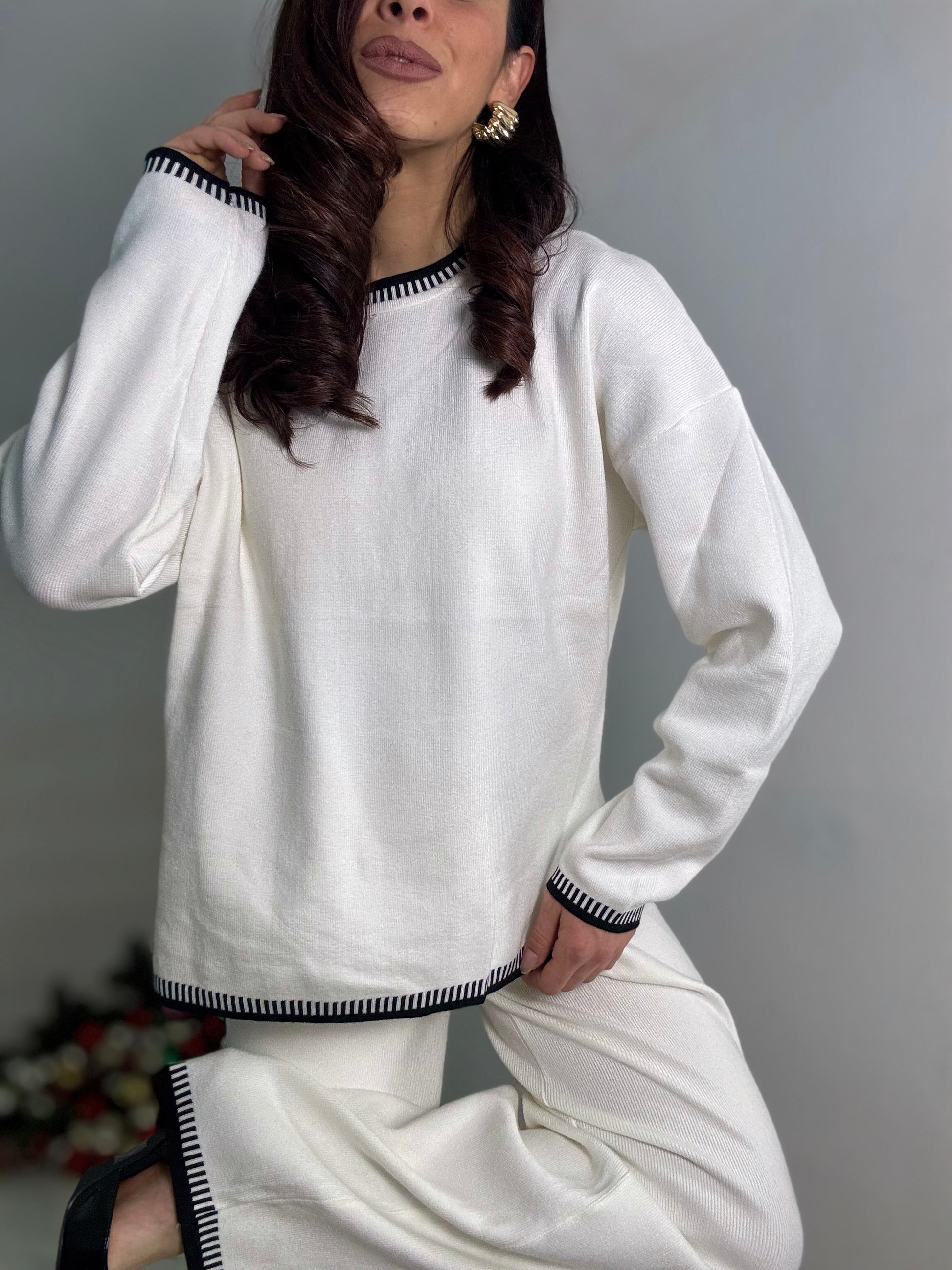 Set composto da pantalone a palazzo con fondo riga a contrasto e maglia lunghezza regolare veste fino ad una 46