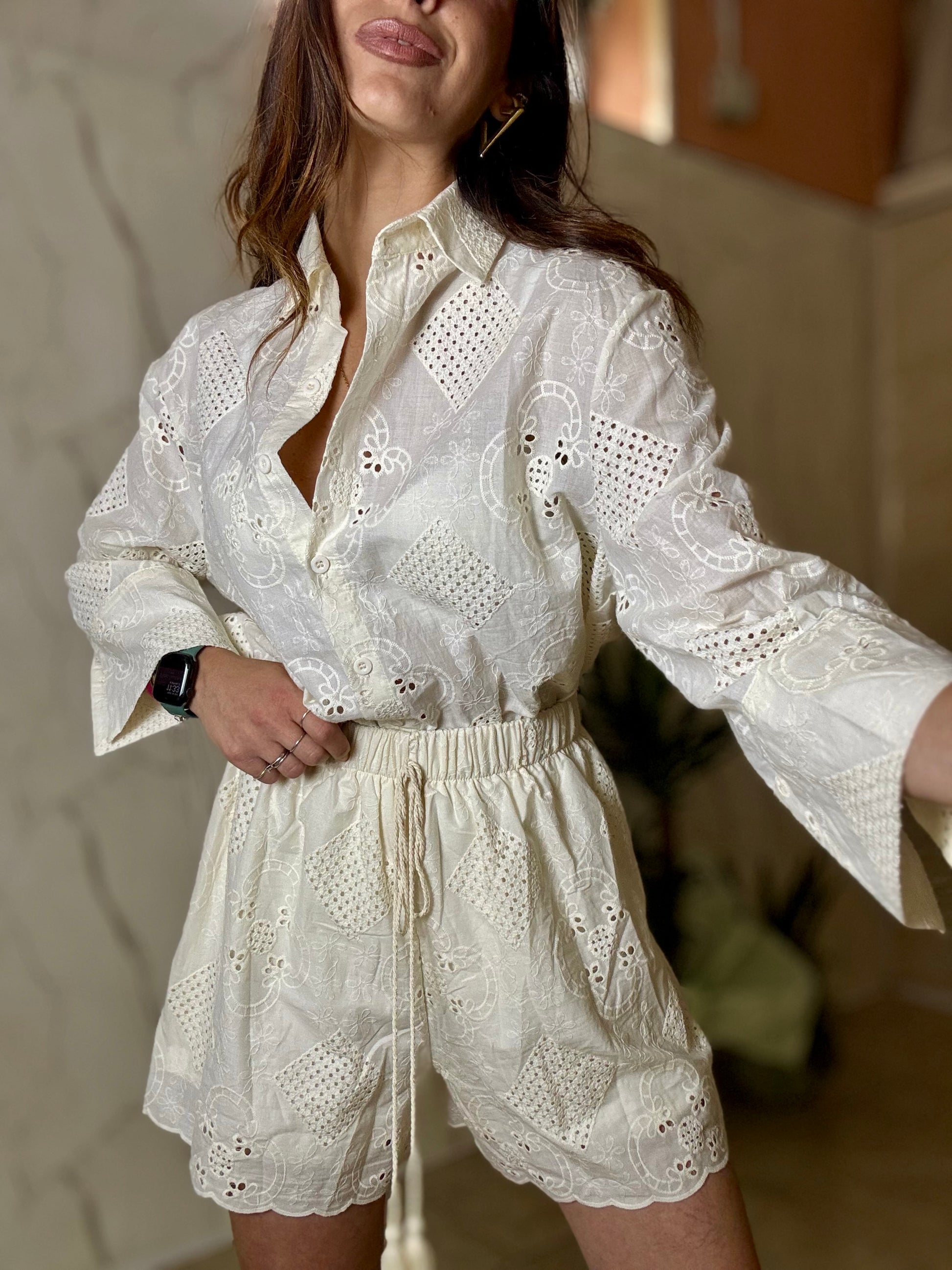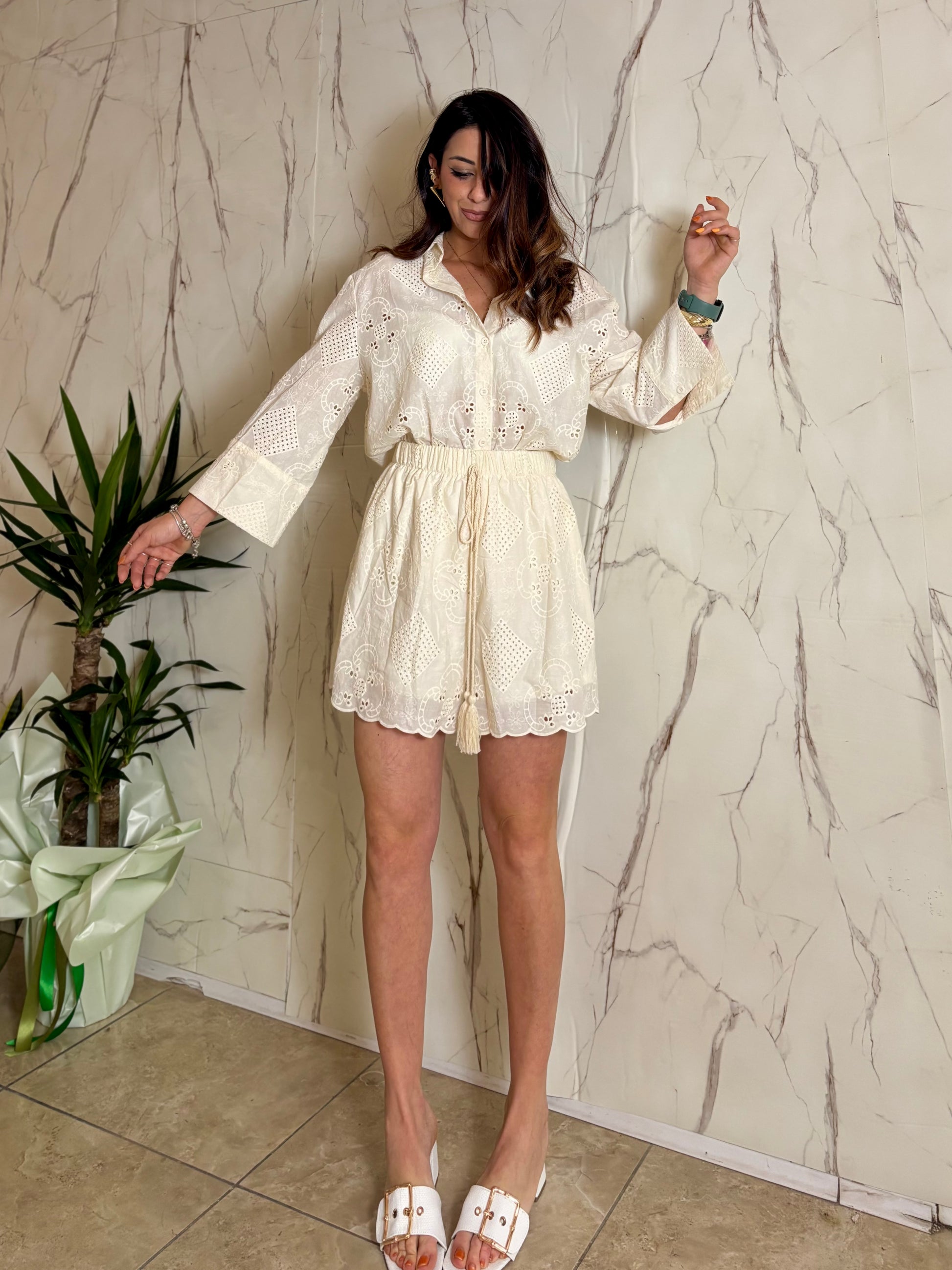 Set in pizzo San gallo composto da pantaloncini e camicia lunghezza regolare tg U veste fino ad una 46