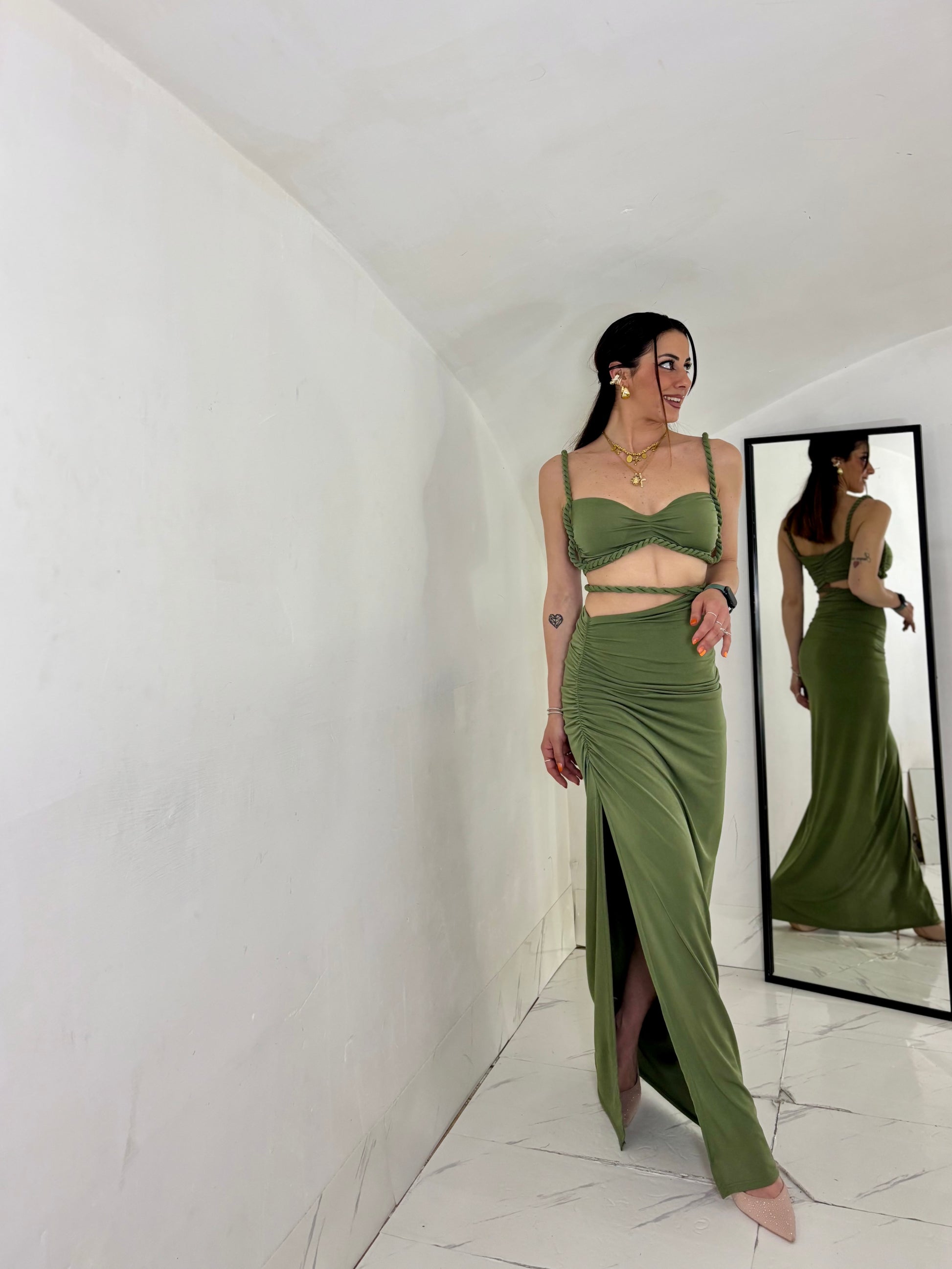 Set in lira morbida composto da gonna lunga con drappeggi e spaghetti laterali, fascia con dettagli cordino taglia unica, veste ad una 46