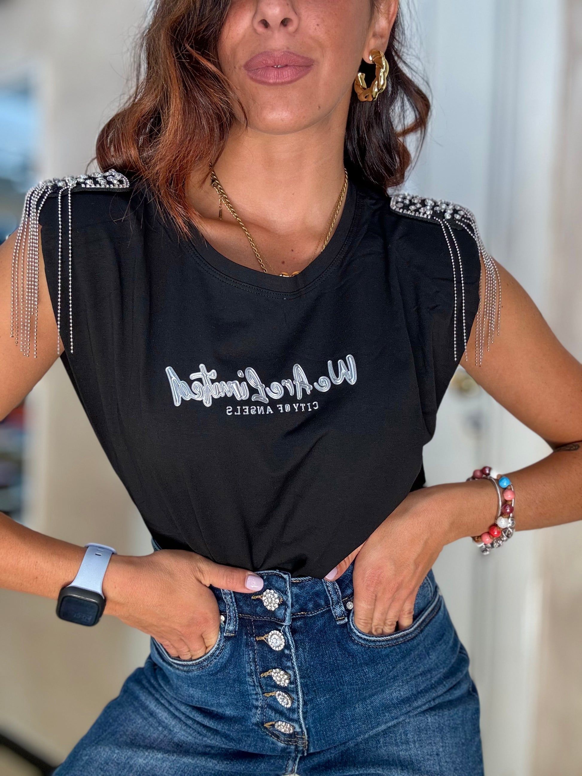 T-shirts cotone giro manica con spallina imbottita e frange e catenine metalliche lunghezza regolare stampa in rilievo frontale