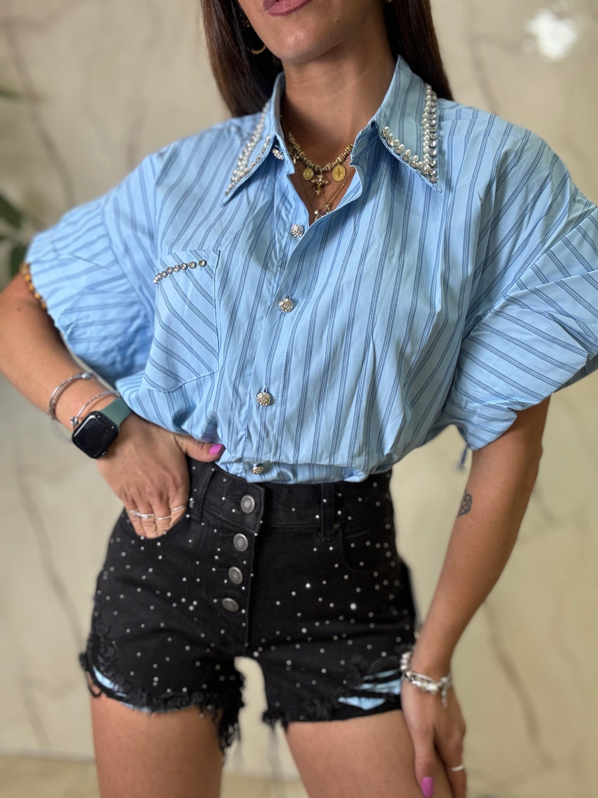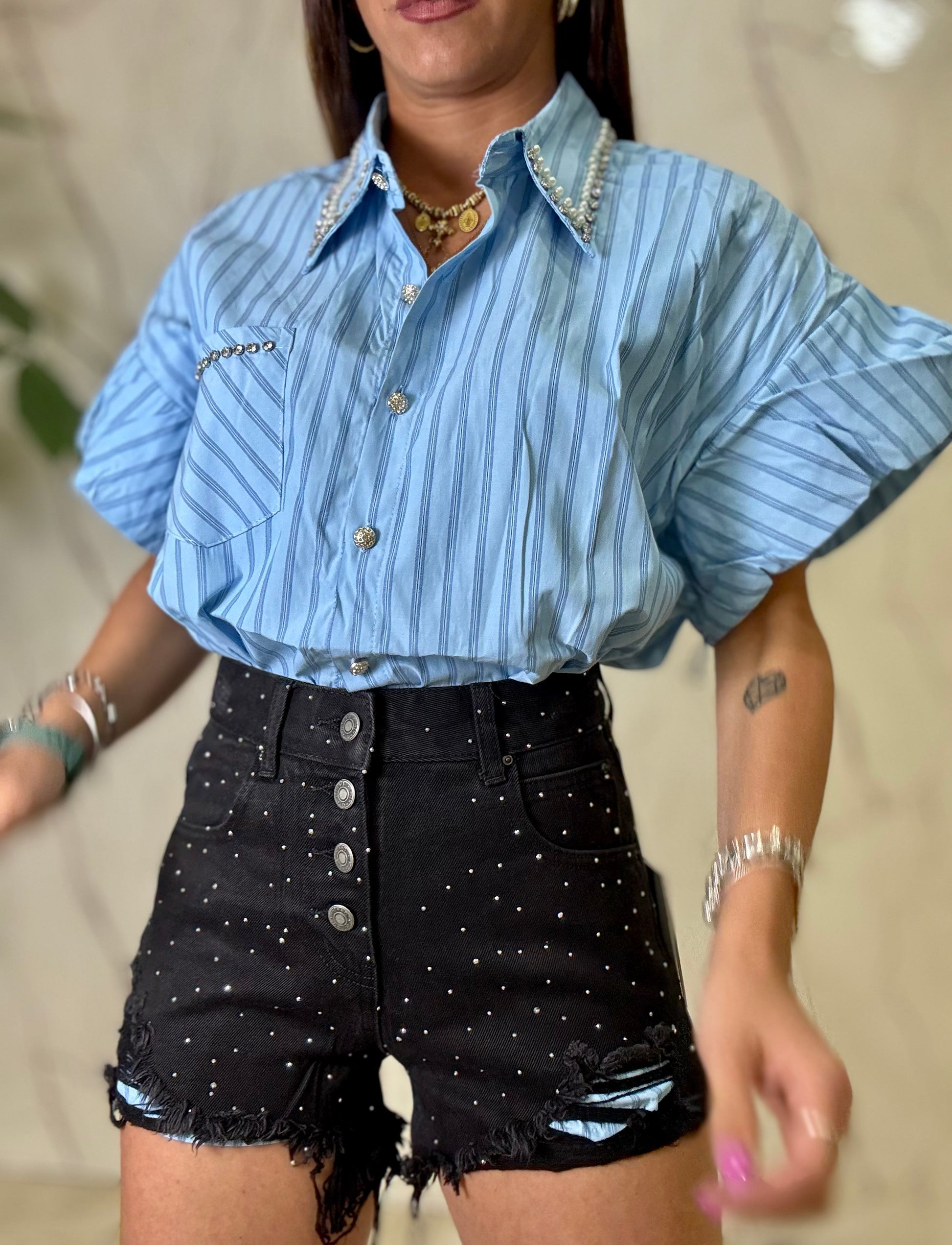 Shorts brillantinato frontale con bottoni di chiusura vita media vestibilità giusta