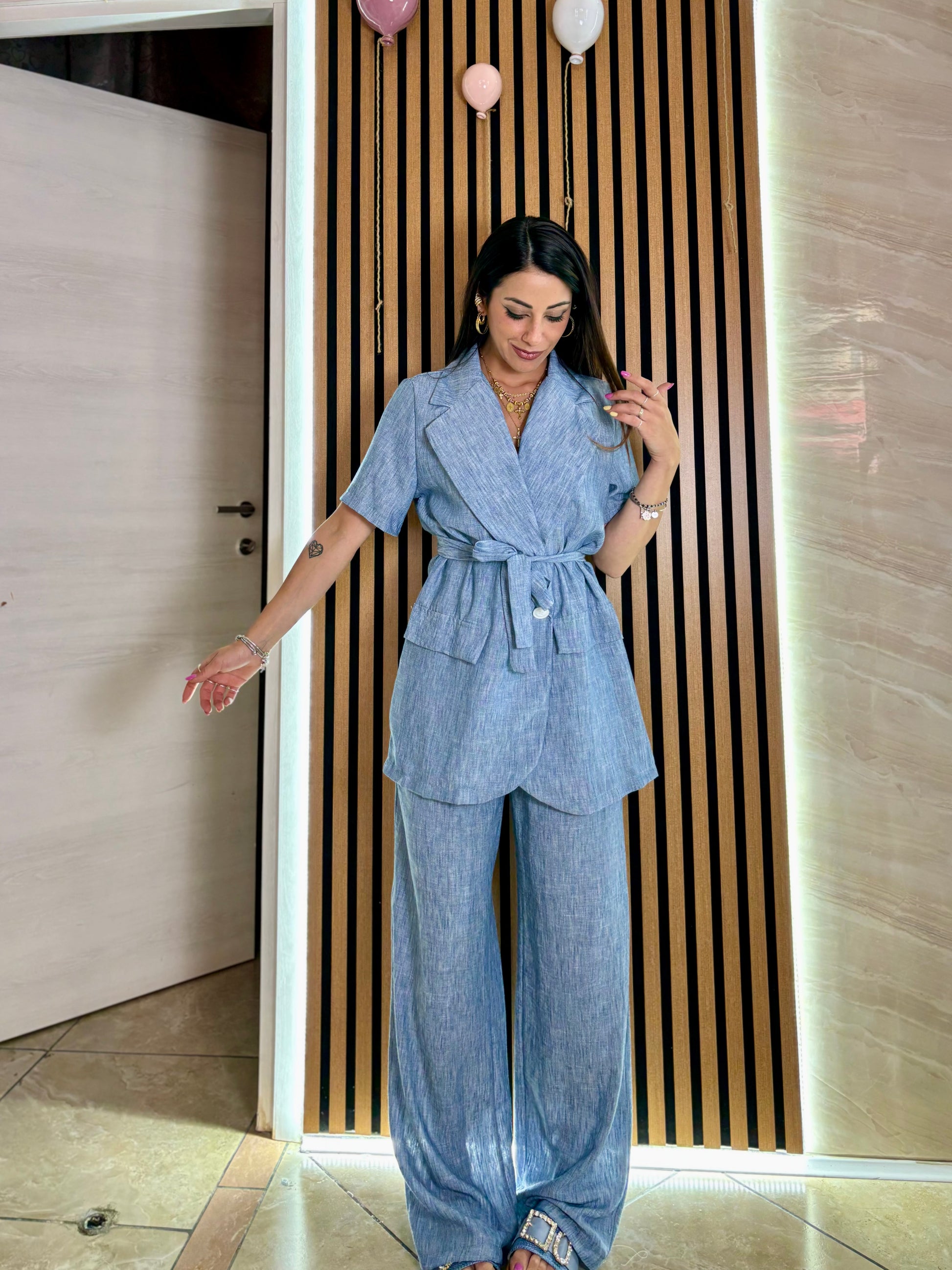 Tailleur in misto lino composto da pantalone gamba dritta e giacca doppio petto con cinturino tg unica veste fino ad una 46