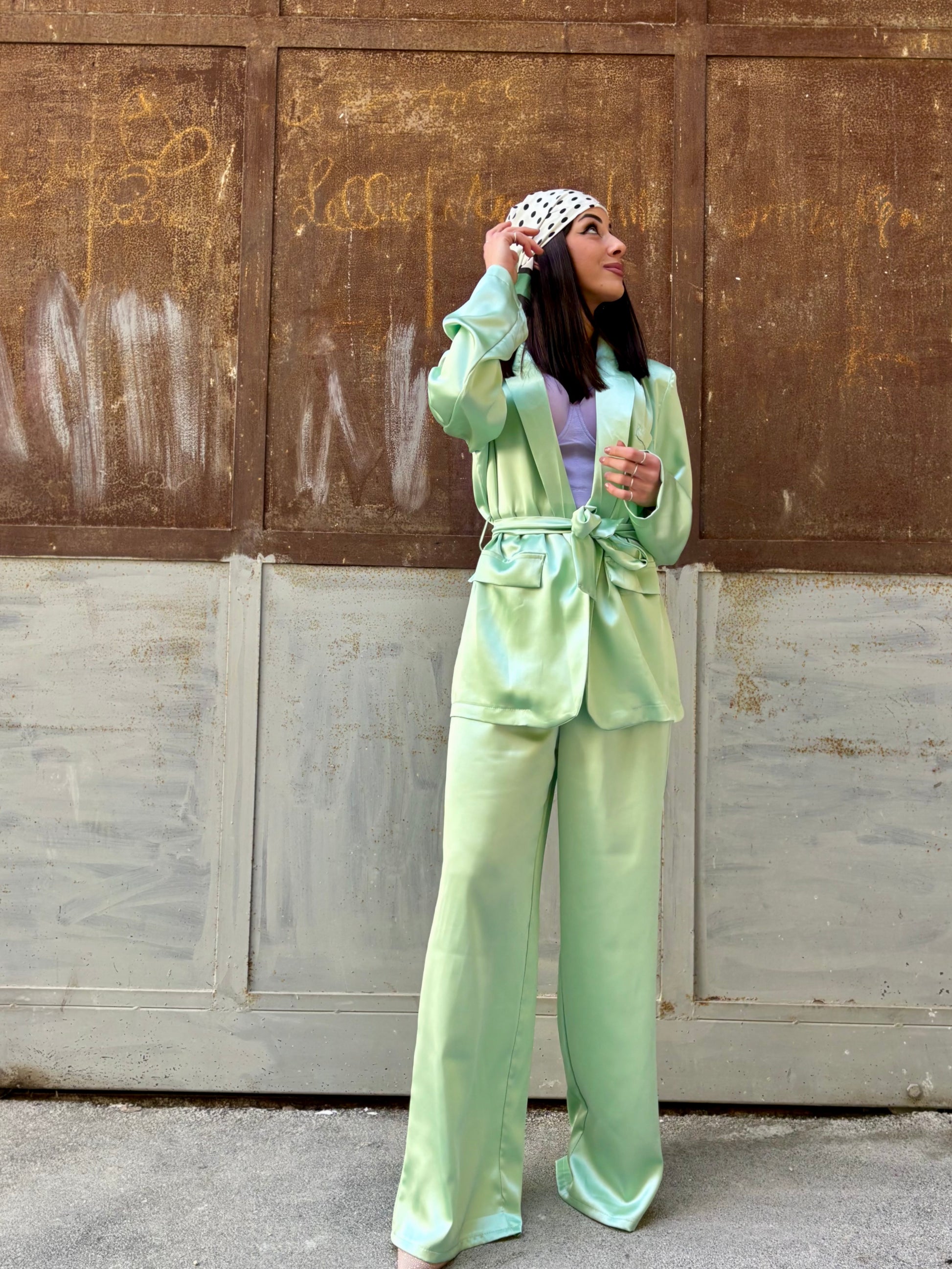 Tailleur raso composto da pantalone con pantalone a palazzo elastico in vita abbinato alla giacca con cintura veste fino ad una 46