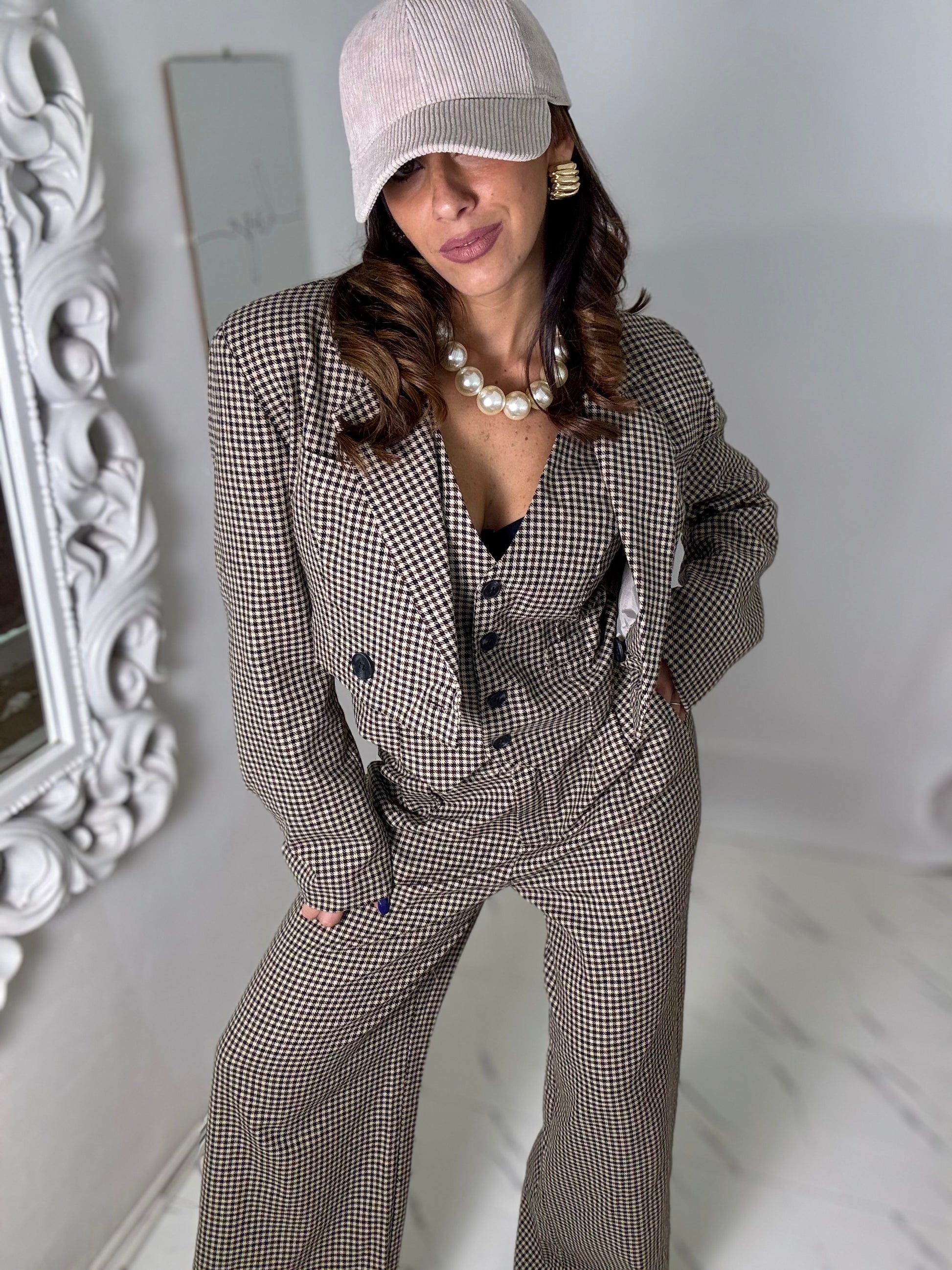 Tailleur composto da giacchino a quadri e pantalone con elastico dietro modello a palazzo vestono fino ad una 44-46