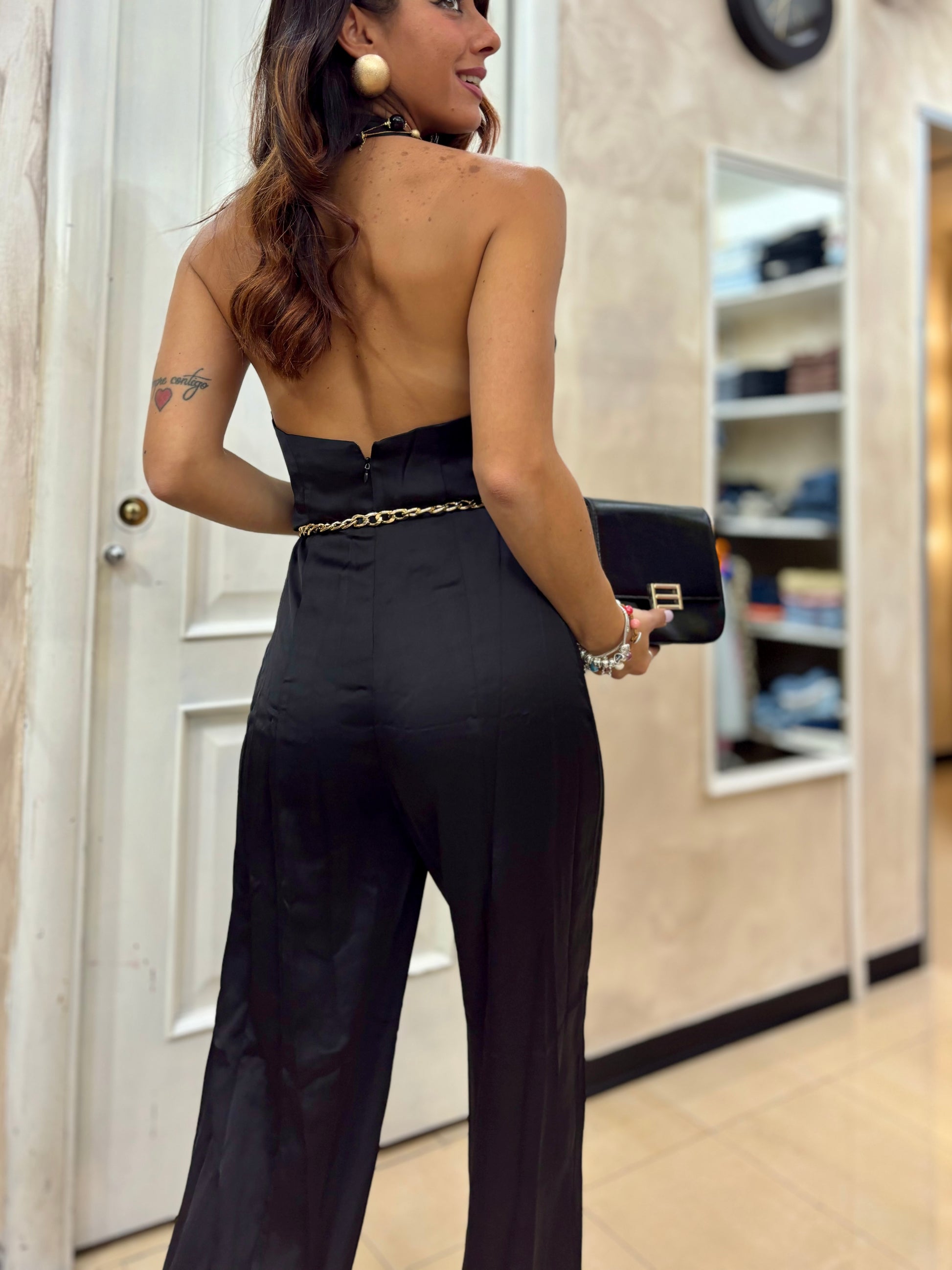 Tuta intera in raso a palazzo scollatura a V applicazione di Rosetta sul laterale con chiusura dietro al collo e scollatura profonda
