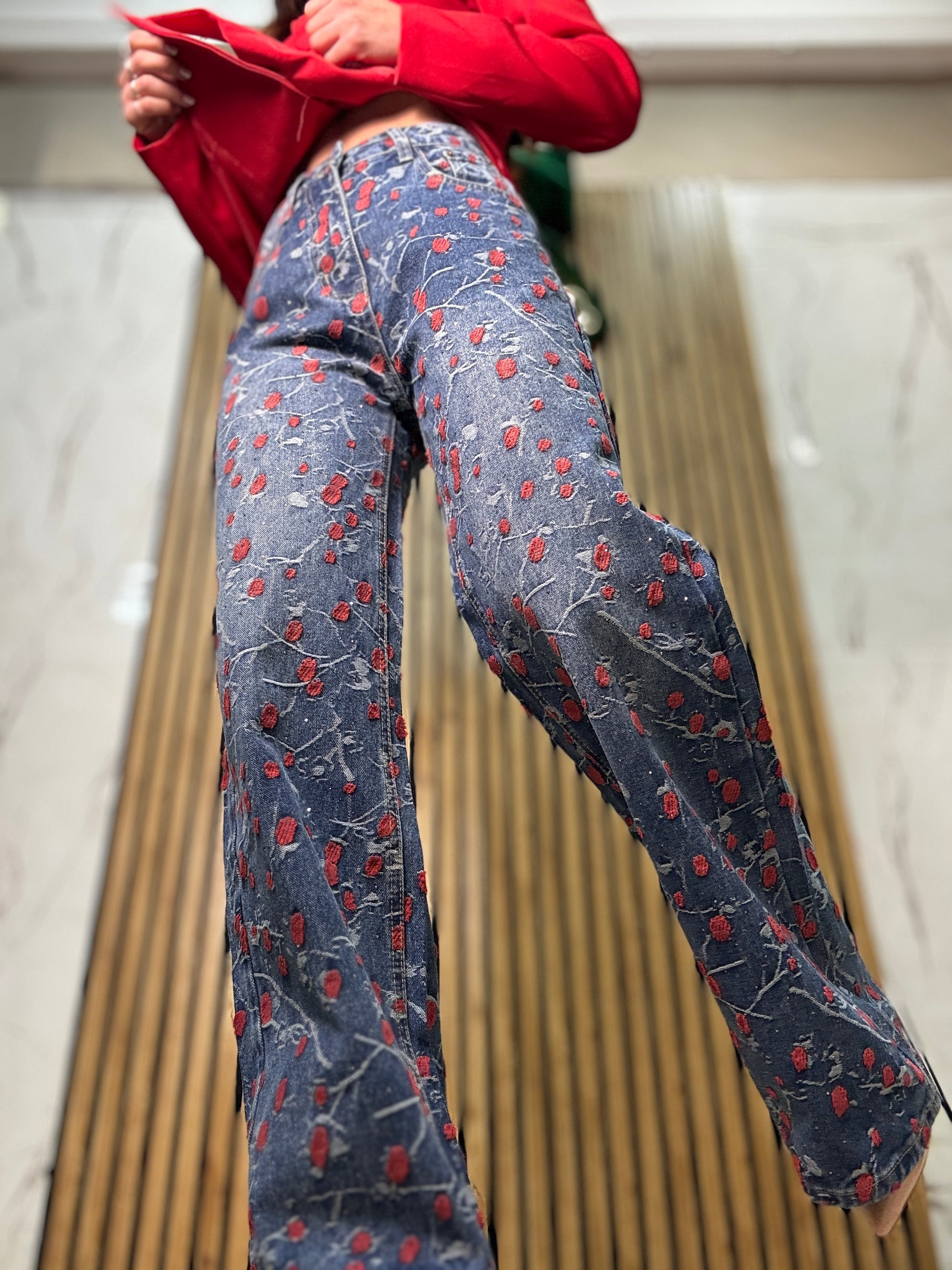 WIDE leg con dettagli strass e rose piccole vita alta tela fissa