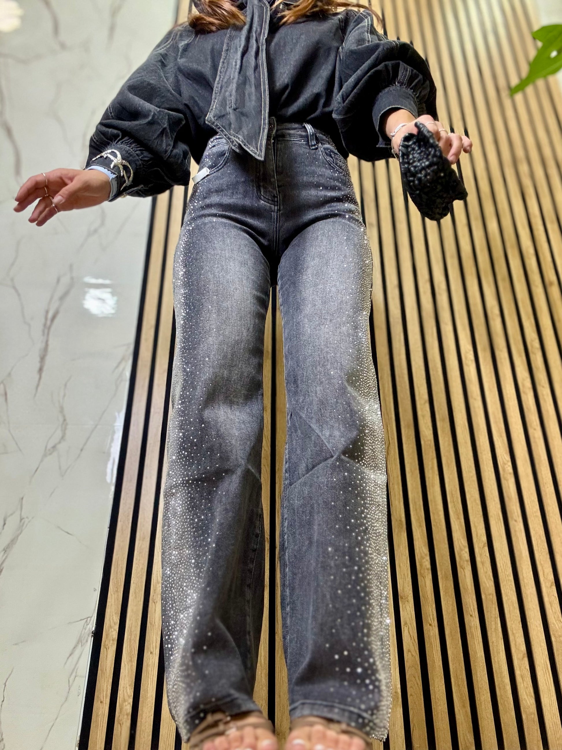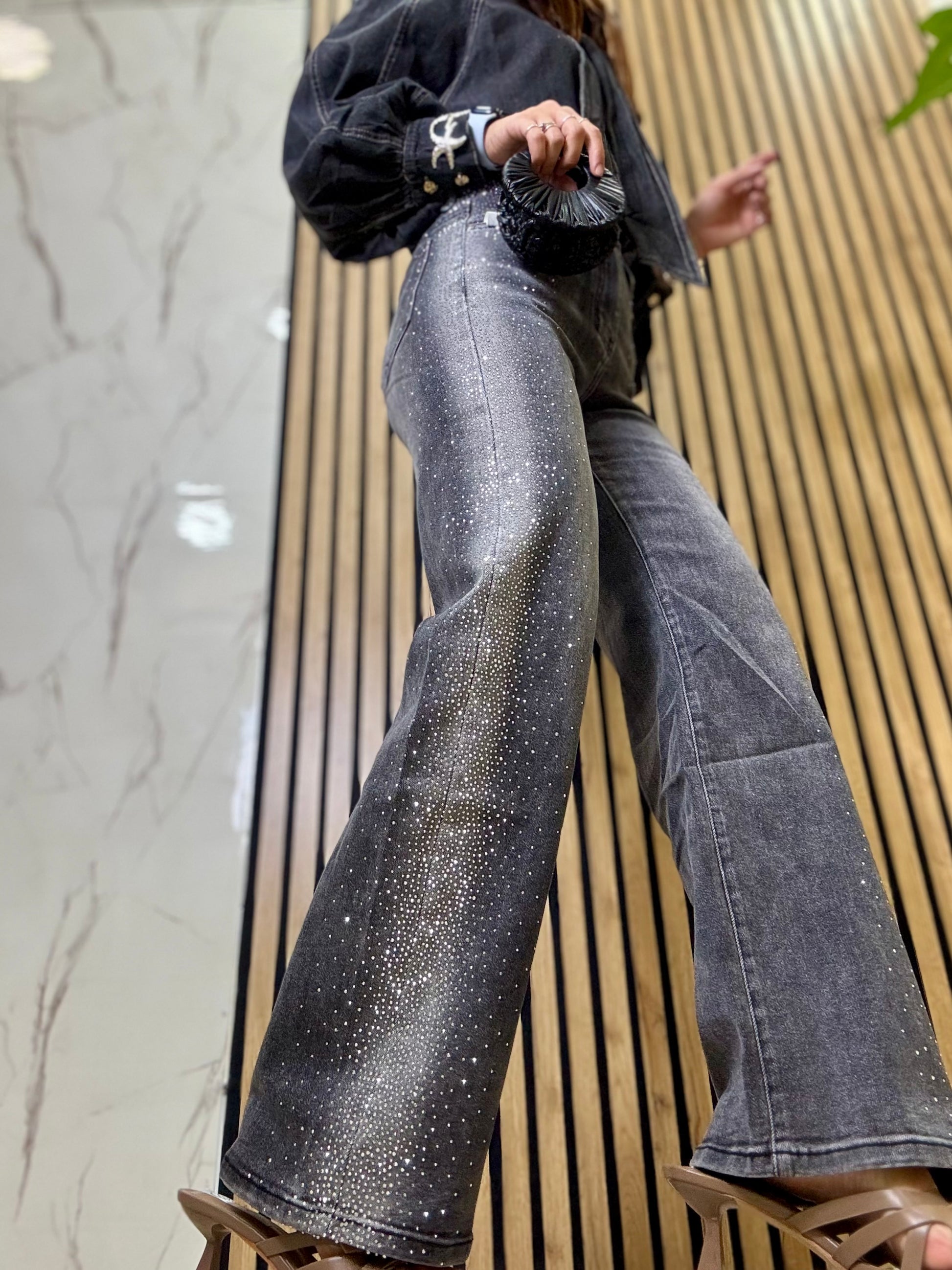 WIDE grigio slavato vita alta tessuto leggermente elastico dettaglio cascata di strass laterale