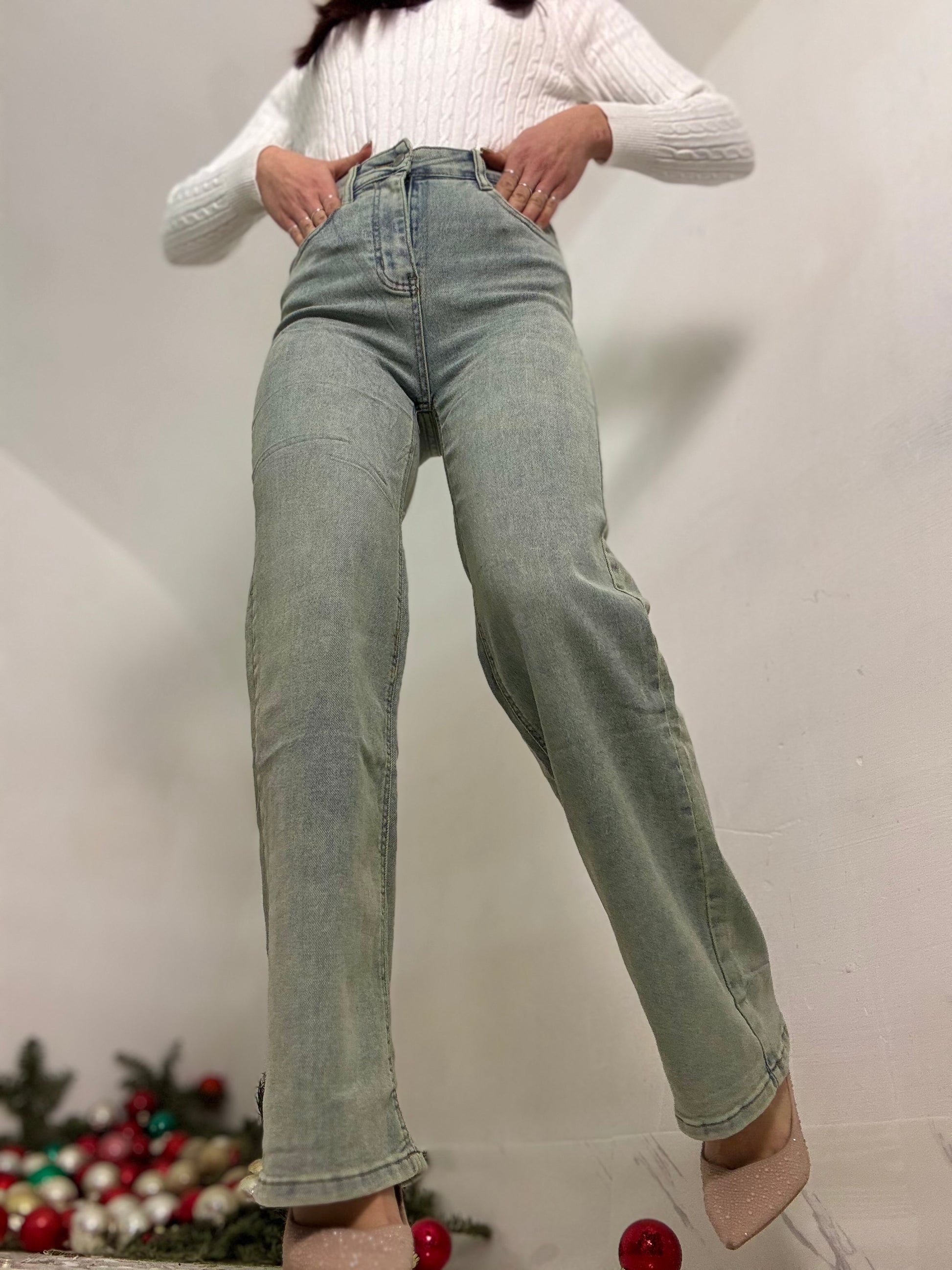 WIDE leg vita alta lavaggio verde slavato tessuto leggermente elastico