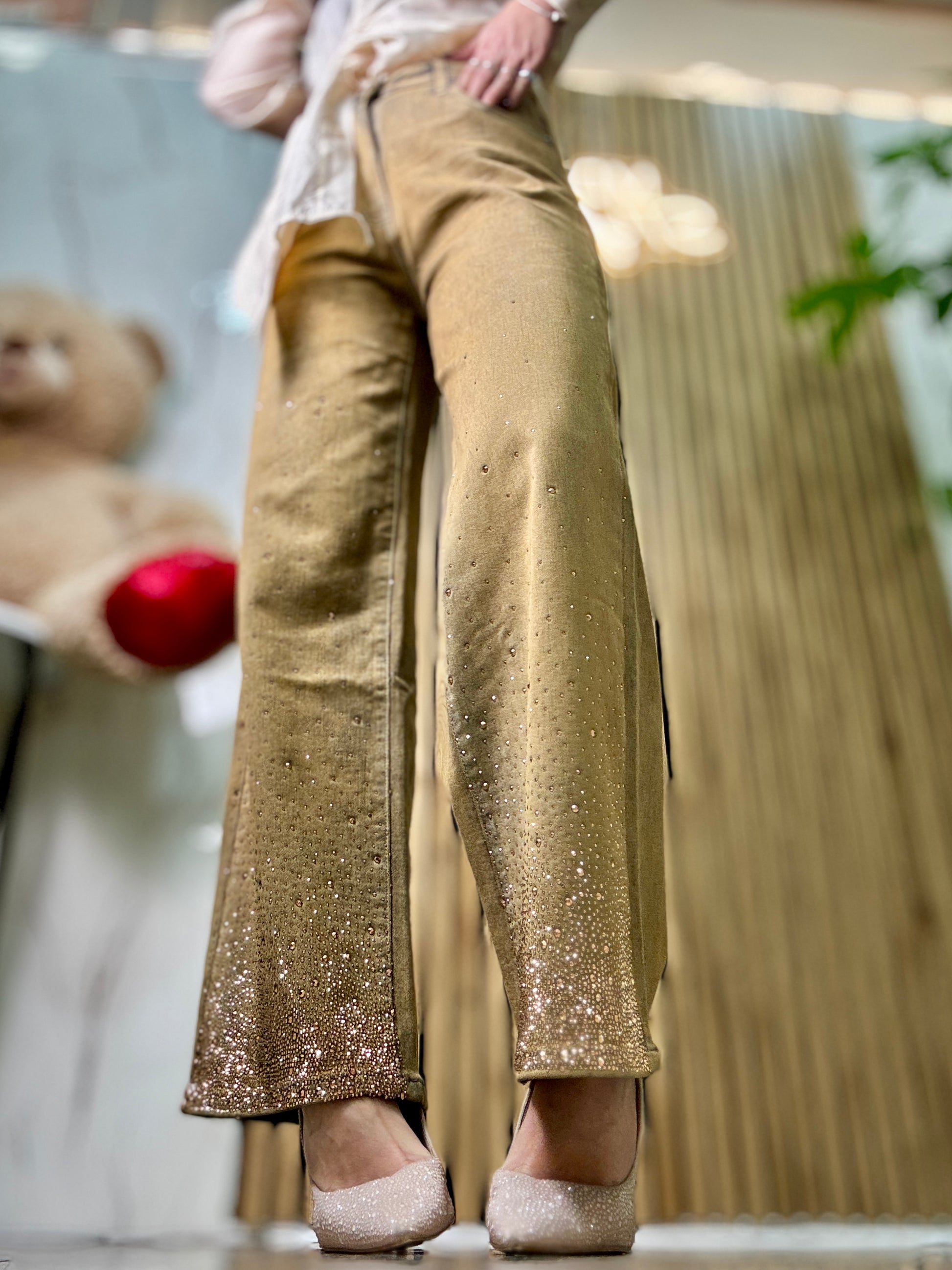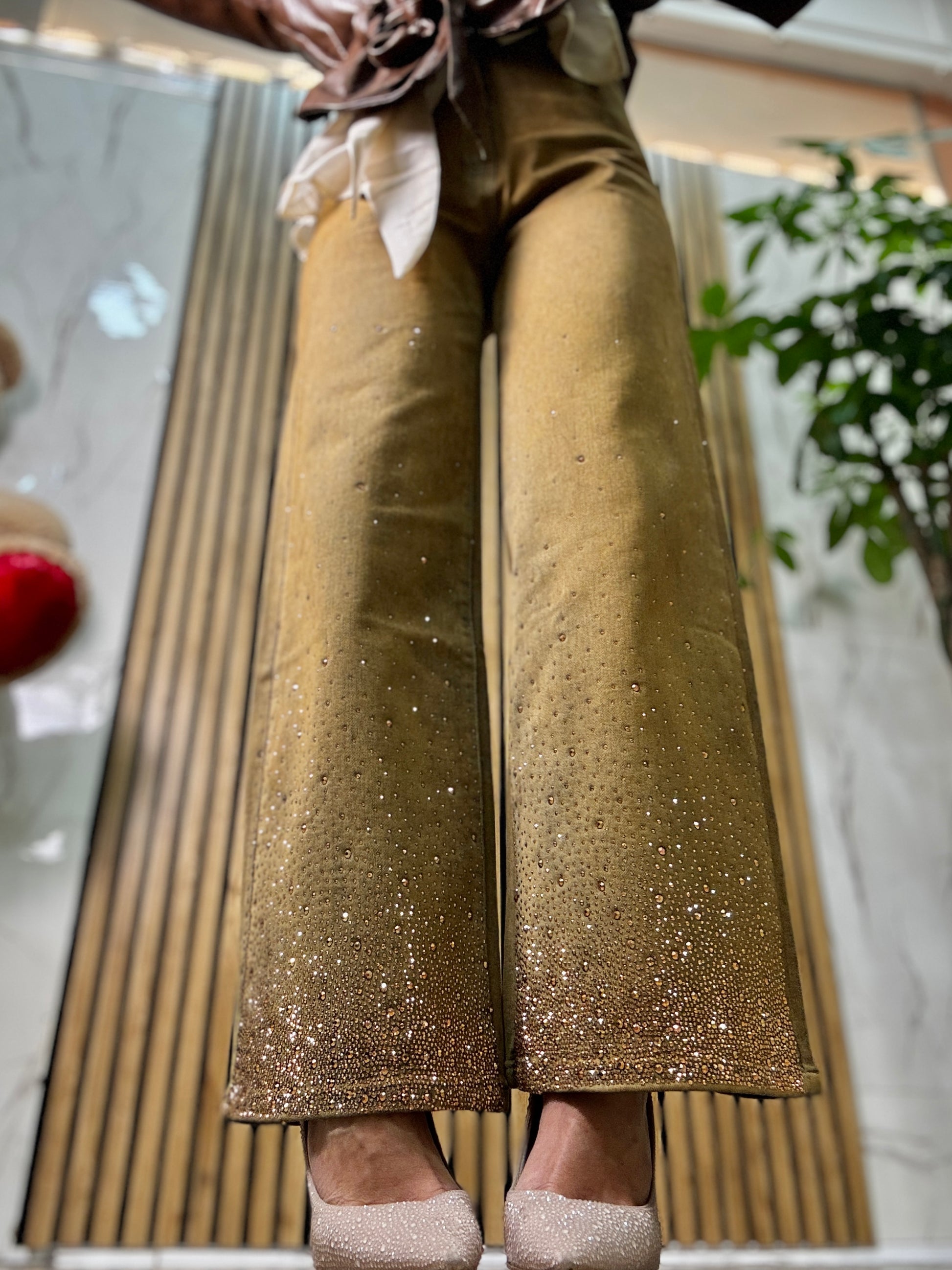 Wide leg sabbia con dettagli strass vita alta tessuto elastico