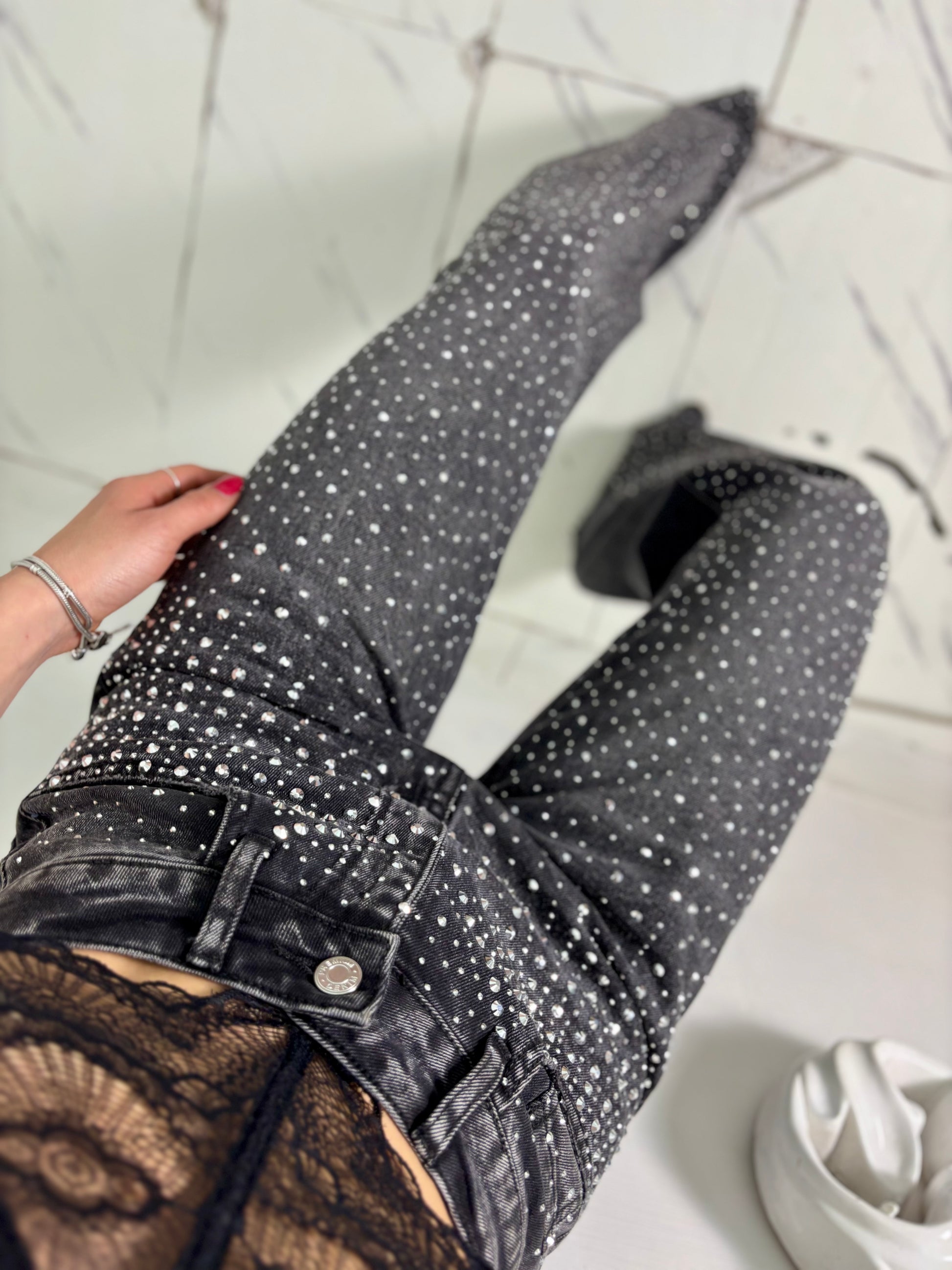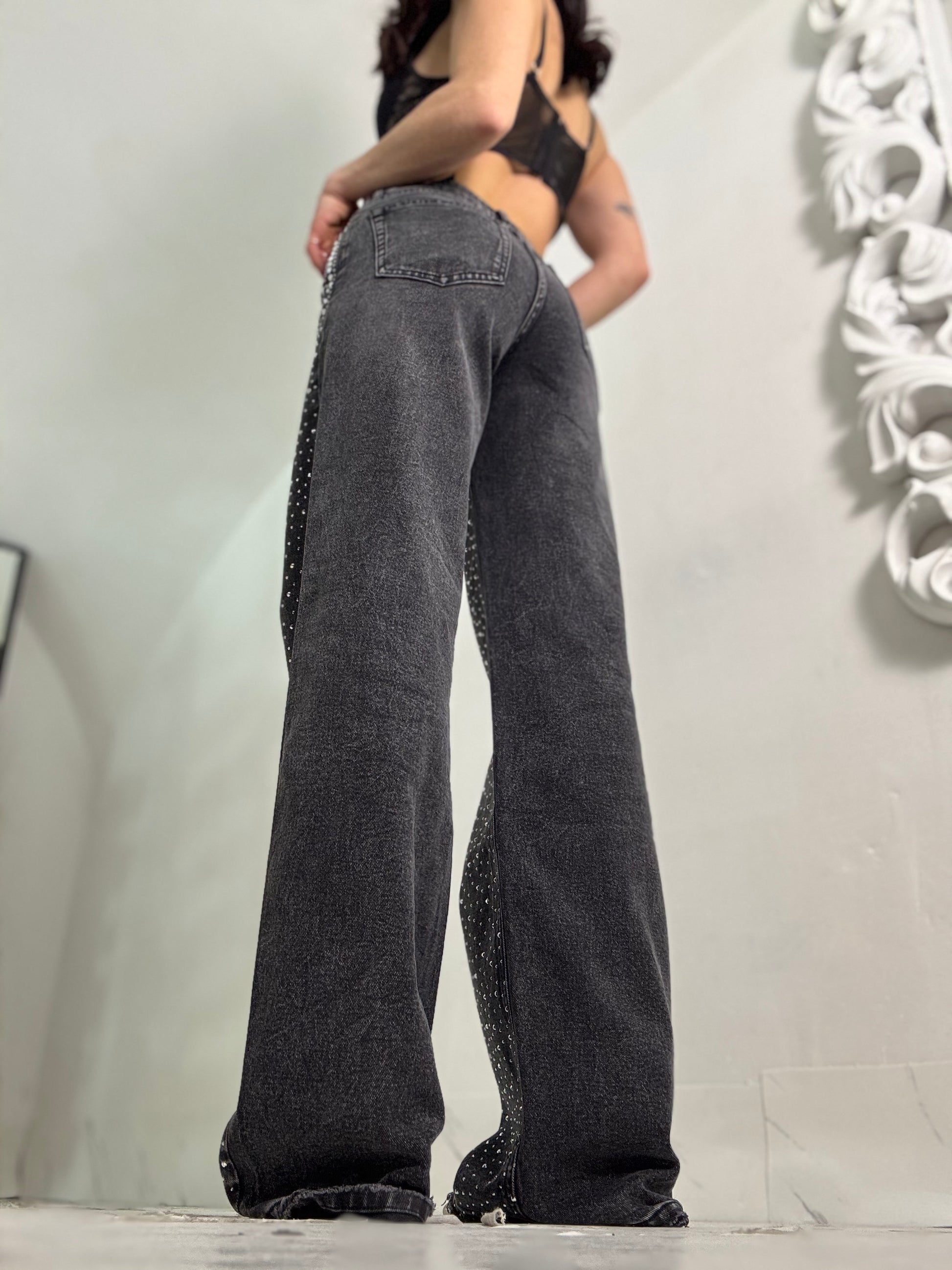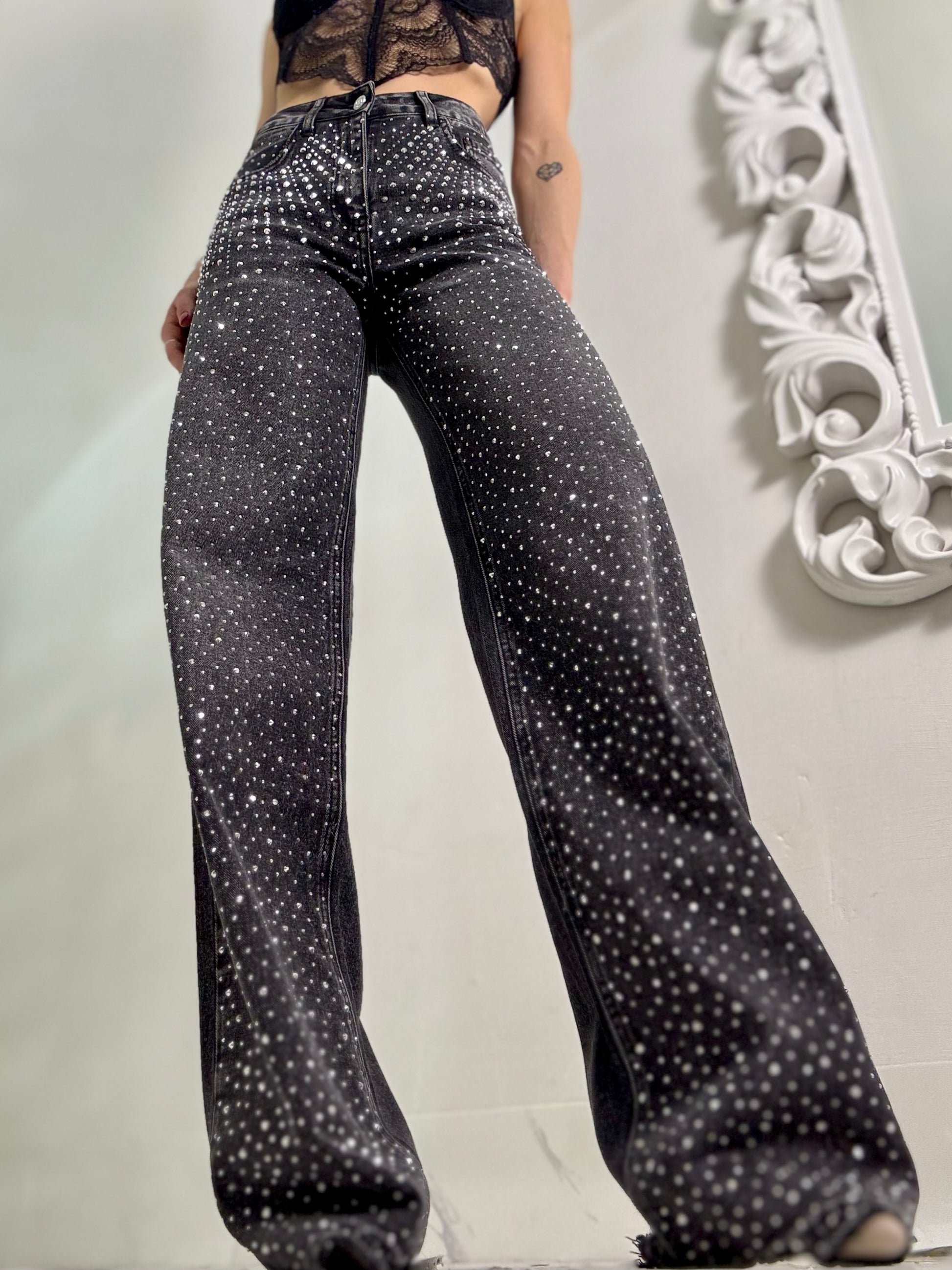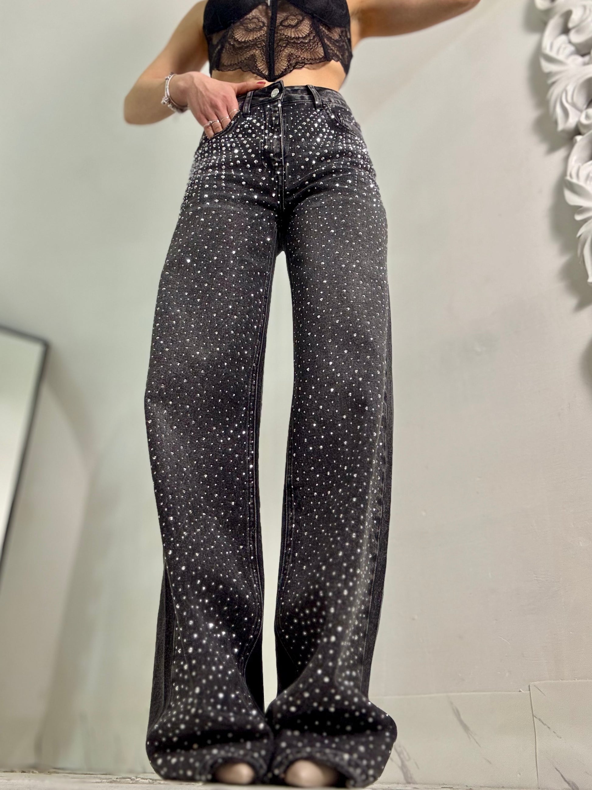 WIDE leg gamba dritta completamente strassato sulla parte frontale e liscio sul retro vita medio alta tessuto rigido