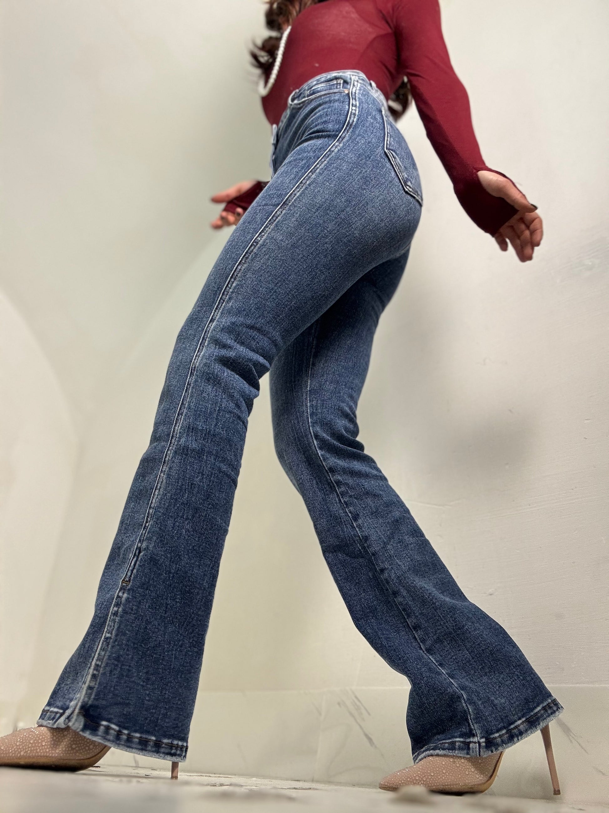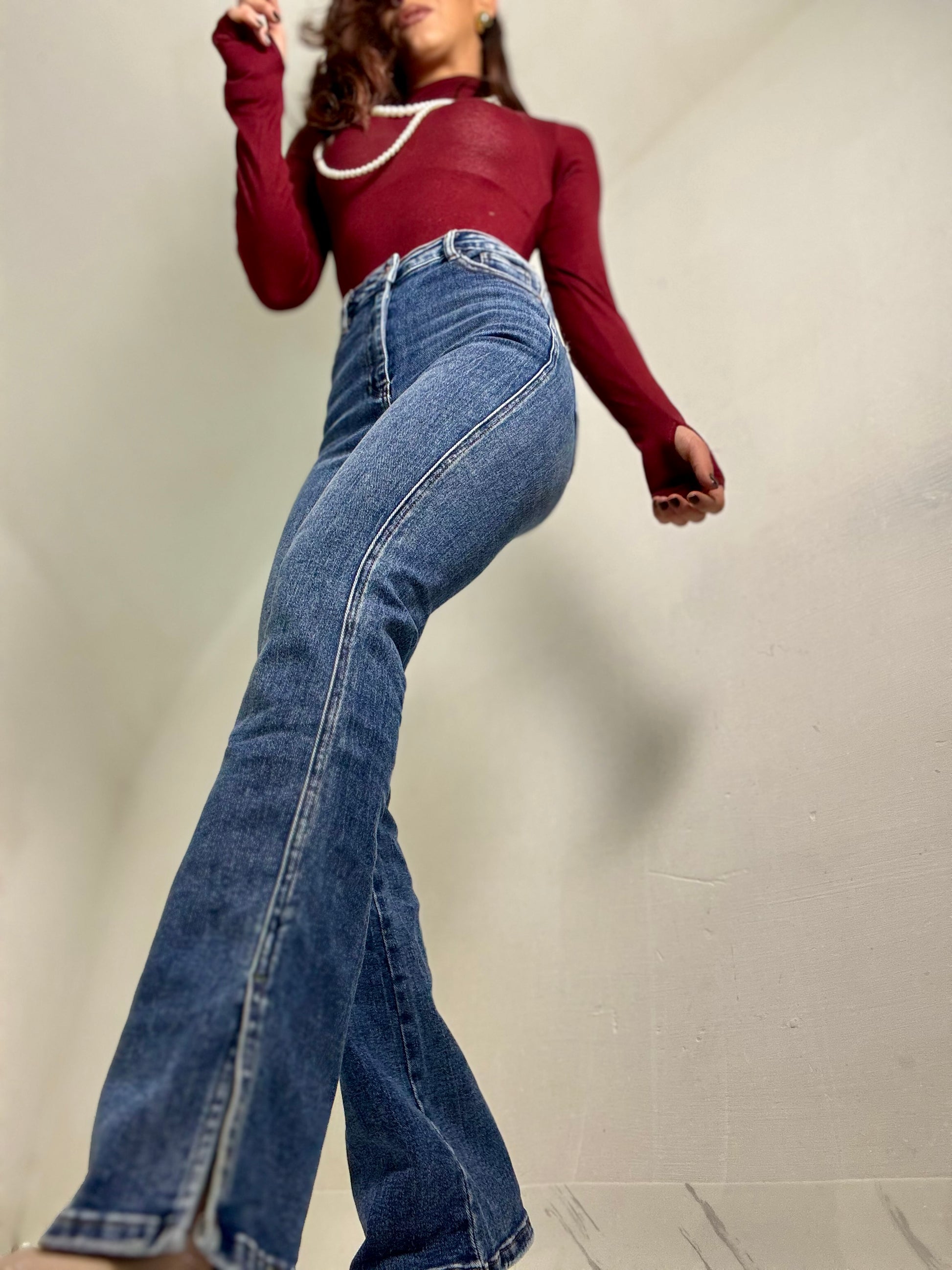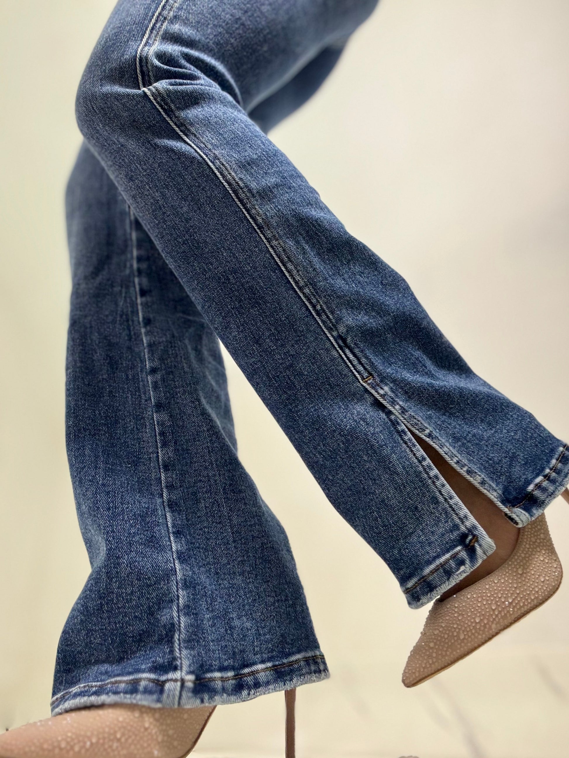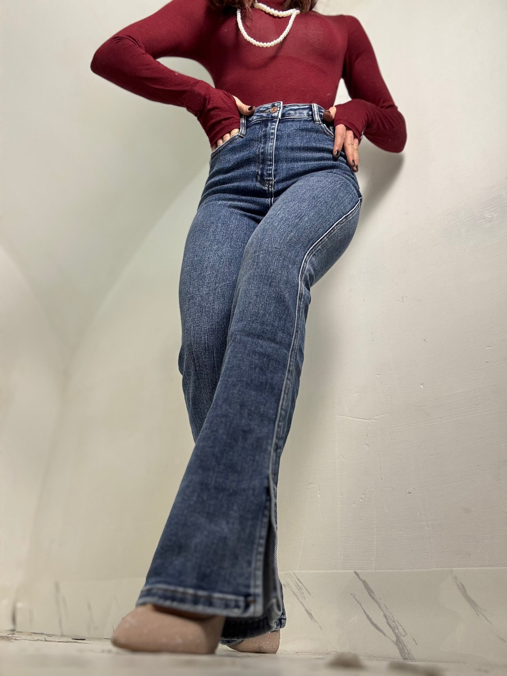 Jeans a zampa Vita altissima lavaggio blu slavato Elastico spaccato sul fondo